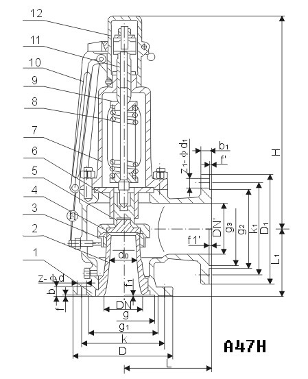 A47H带扳手弹簧微启式安全阀适用于工作温度≤350℃的蒸汽、空气等介质的设备或管路上,作为超压保护装置。