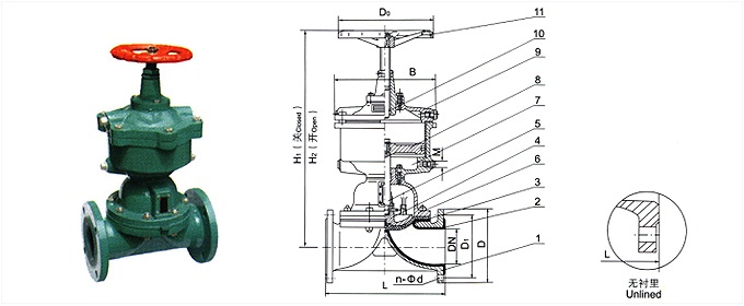 部件列表: 1、阀体 2、阀体衬里 3、隔膜 4、阀瓣 5、下阀杆 6、阀盖 7、气缸 8、活塞 9、气缸盖 10、上阀杆 11、手轮