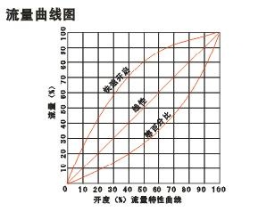上图为该种阀门的流量特性曲线,本厂生产的是其中等百分比特性阀门。从曲线图上可知给开度一个相等的变化率,则流量的变化率相等,其特点是开度大时流量大,开度小时则流量小。而工程中大都在流量大时应用,等百分比阀门恰恰适用这个要求。根据这一特点,可以自如的予置某更高量(快开阀门和线性阀门则不具备这种功能)而且当需要变化时,还能知道变化量,达到理想状态。