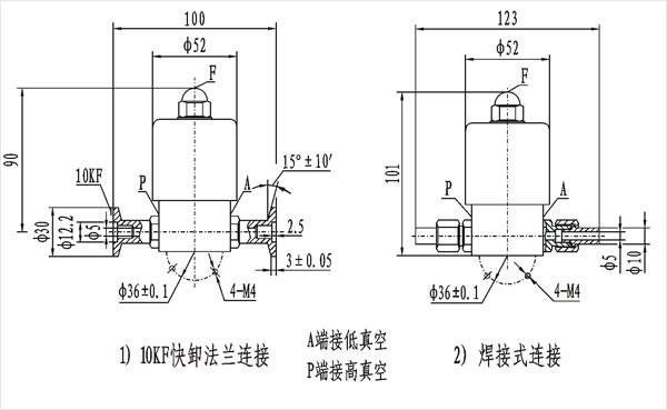 GDC-Q5型电磁高真空带充气阀连接在高低真空系统上,该阀通电阀板打开,同时封闭充气口,将P、A端管路接通;断电时阀板关闭,切断P、A端管路,保证系统的真空度,同时打开充气口,通过F端向A端充气。